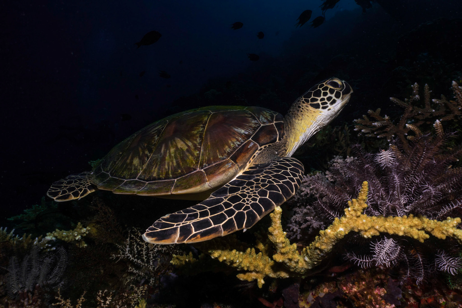 Green Turtles are often found resting on the coral. When inactive they can stay submerged for several hours between breaths.