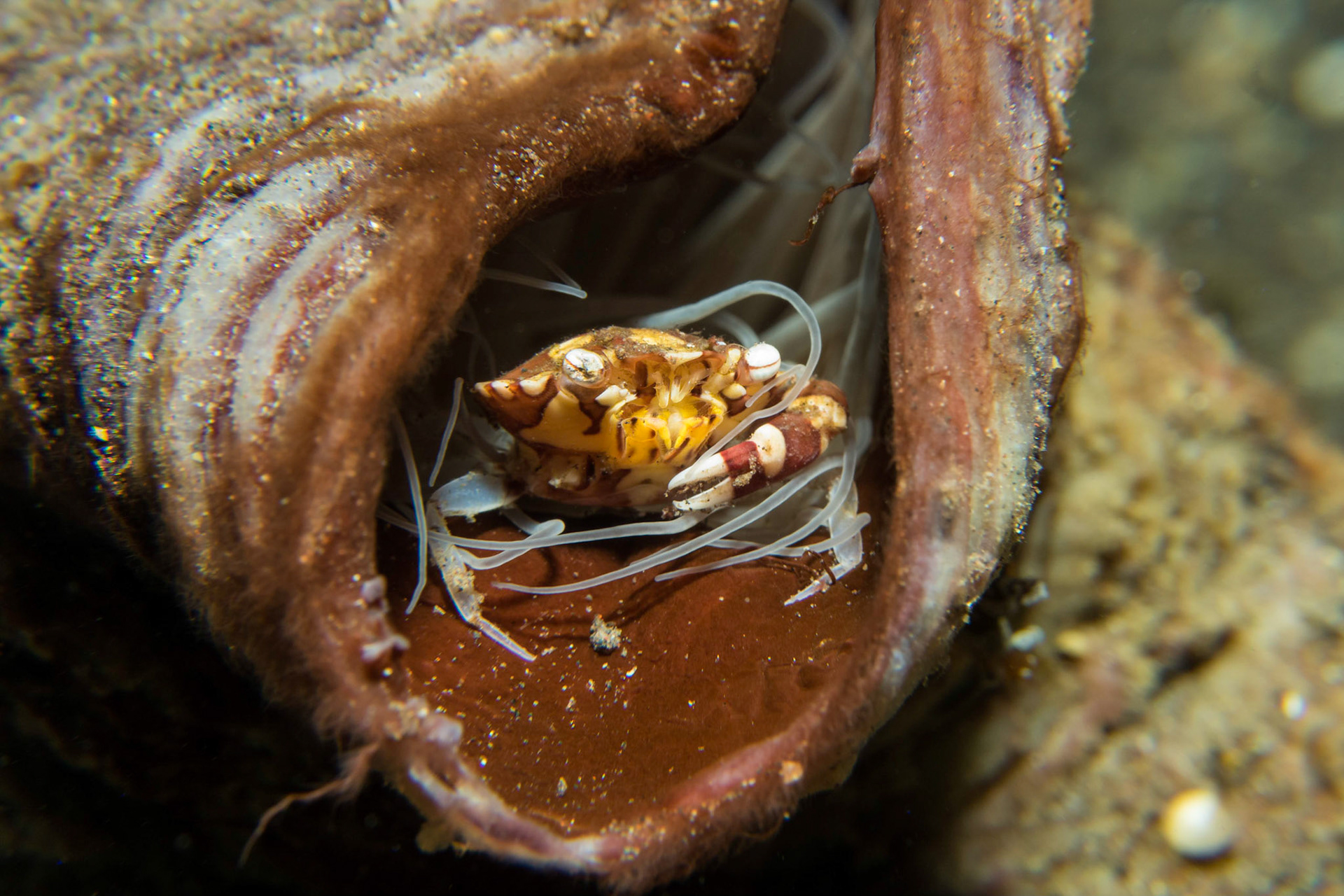 Carid Shrimps are far from shy, making themselves available to other reef creatures as cleaners. This one has chosen to make its home in a Bubble Anemone