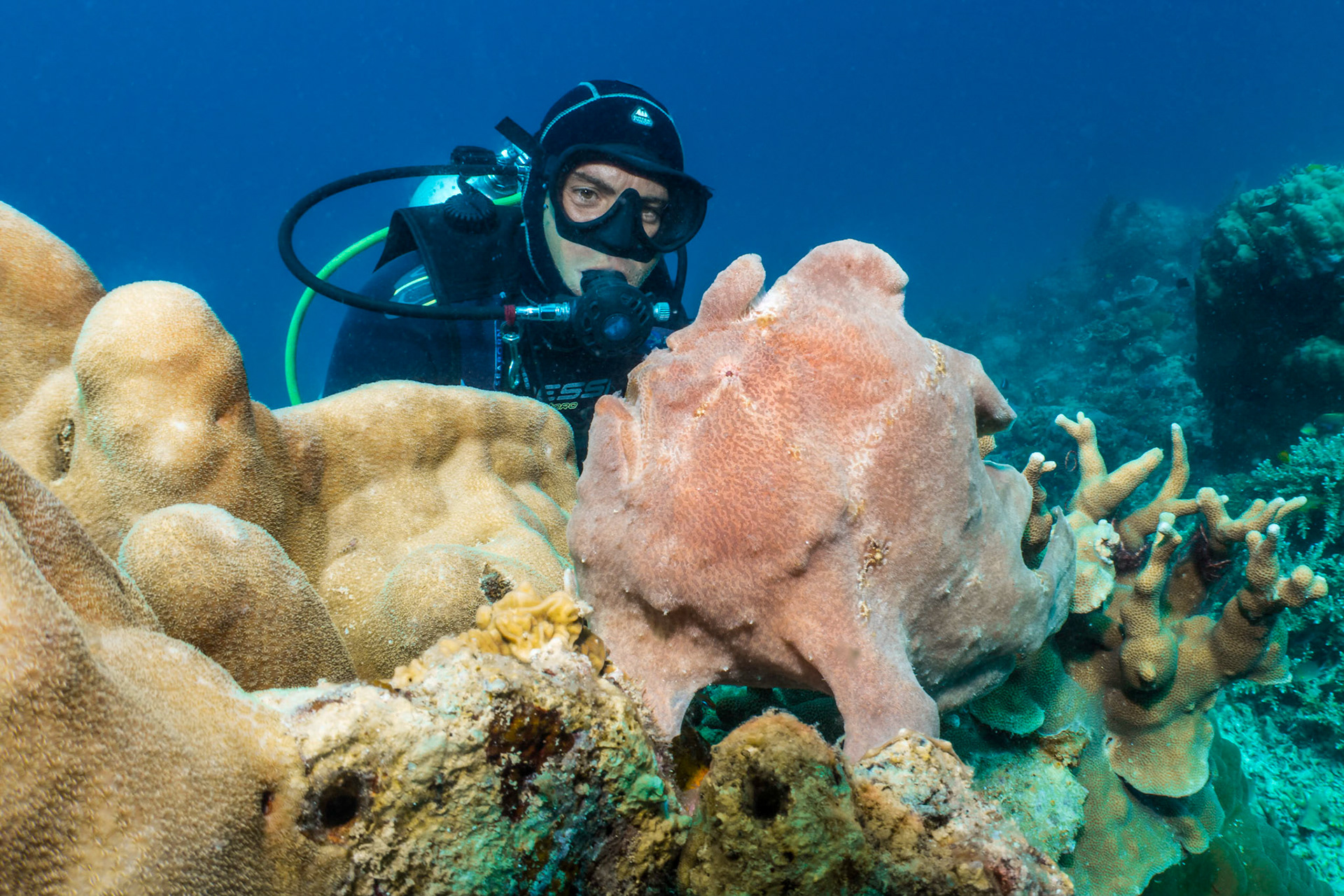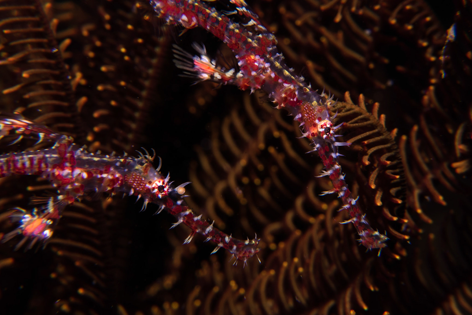 This Sawblade Shrimp was determined to stay on the opposite side of the Whip coral. After a few attempts photographing the neighbouring corals to get the exposure right, I had to then compose a shot where I hoped the Sawblade would move to. With one hand supporting the camera I moved my free hand into the field of view on the other side of the coral. The Shrimp obliged and moved into position but I had to wait until it was happy enough that it didnt move back as soon as I moved my hand away before I could get this shot.