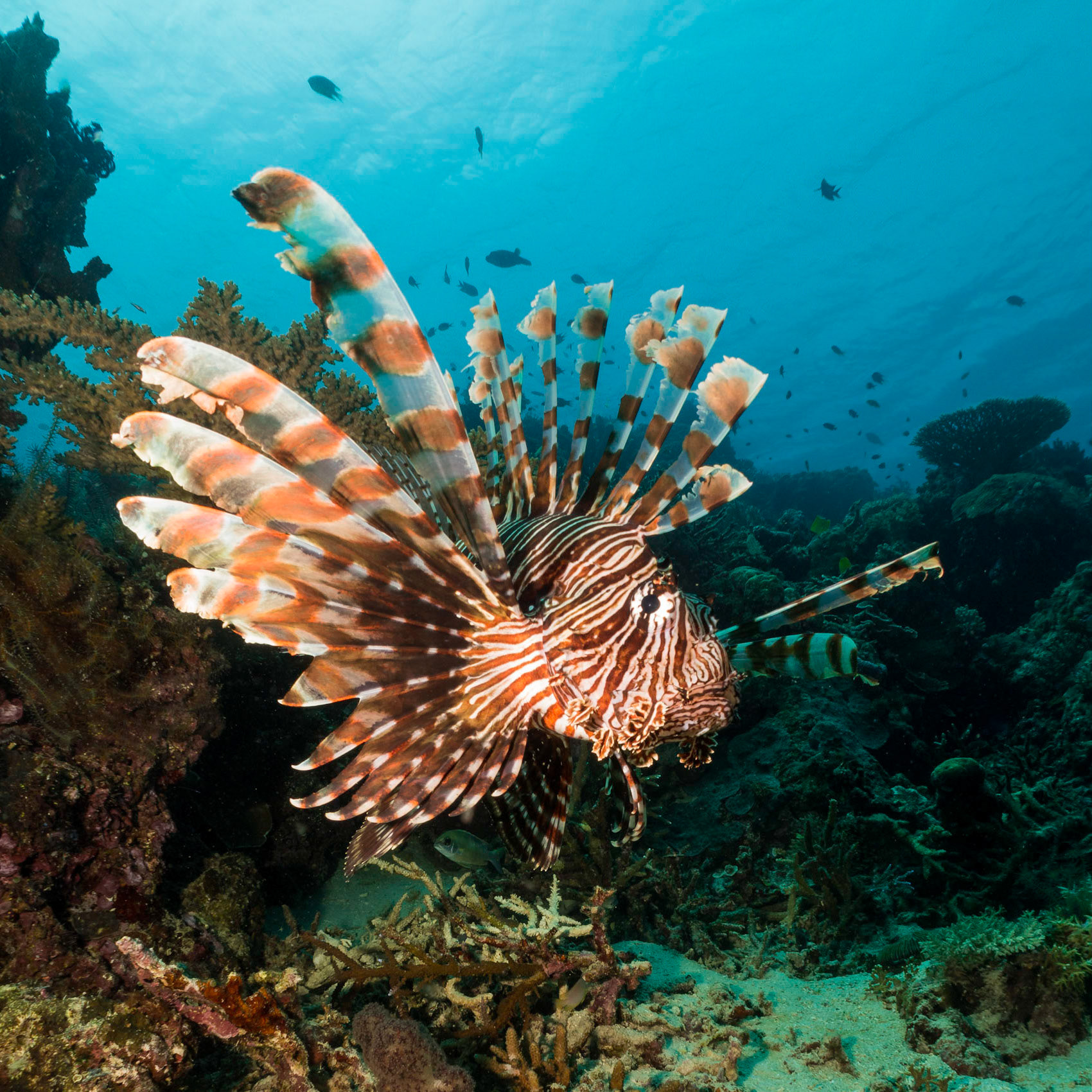 The Flying Gurnard usually spreads its striking "wings" to intimidate potential predators. This individual seemed to be spreading them to prevent a neary unicorn fish from stealing its meal
